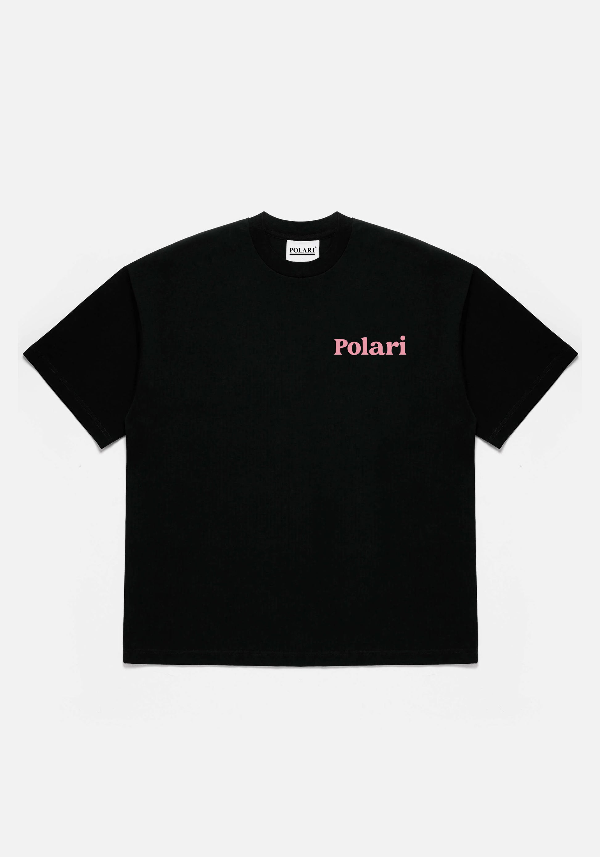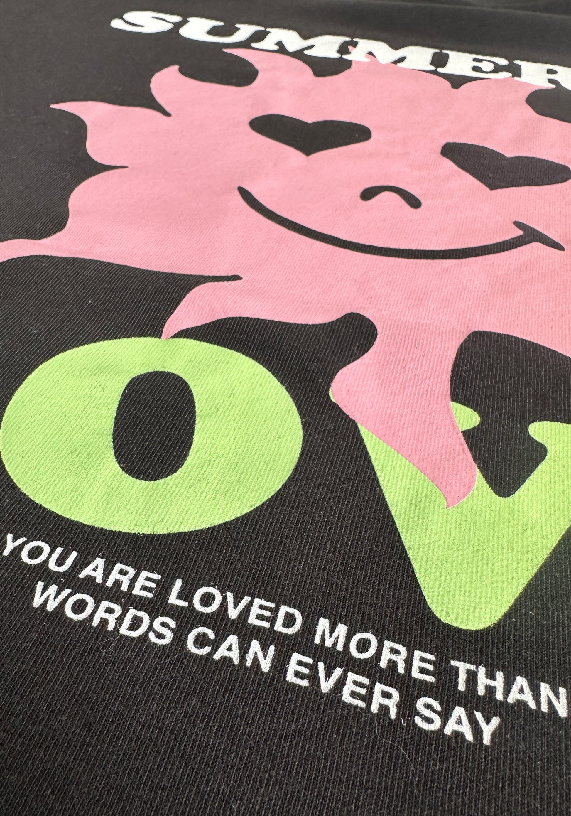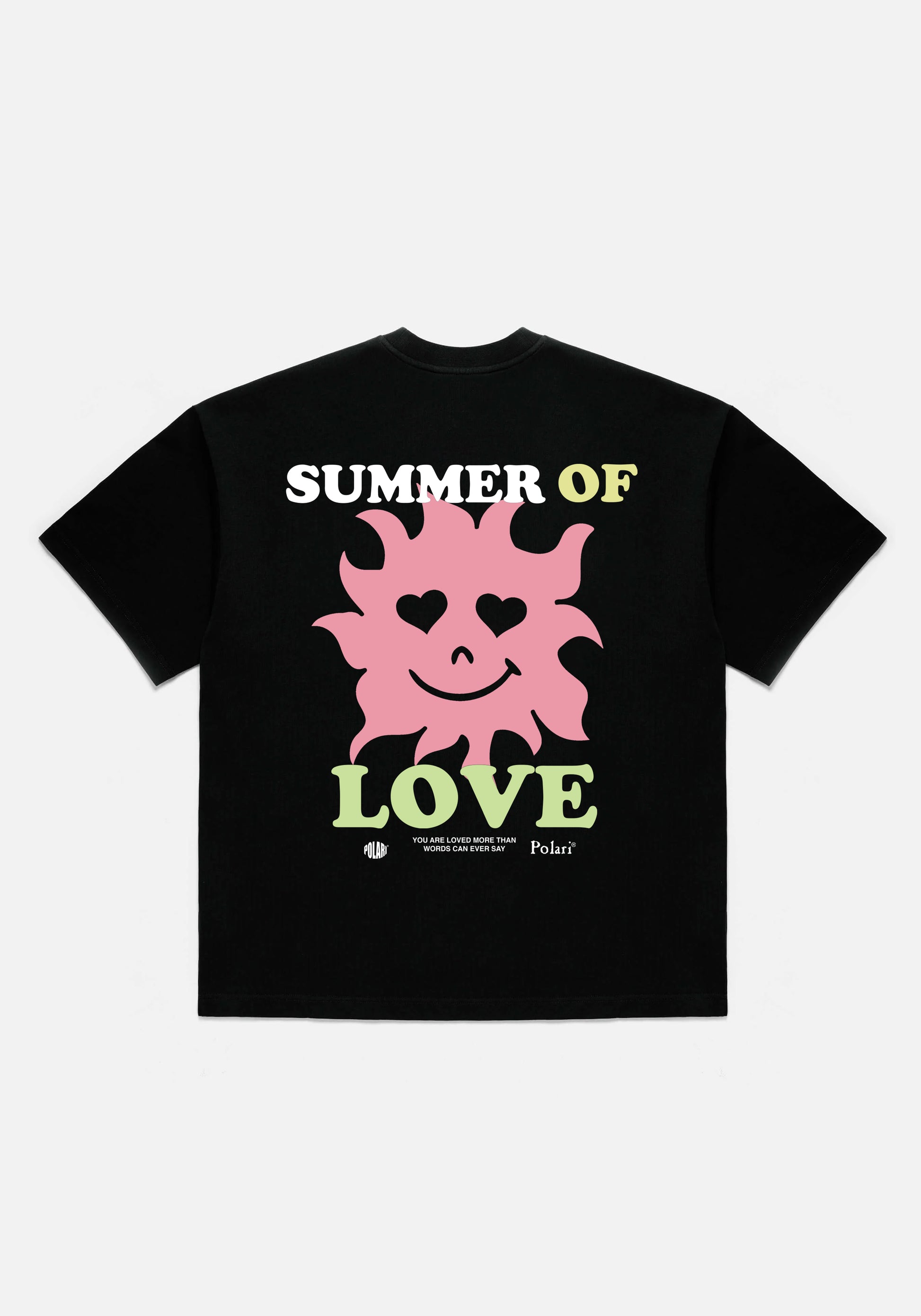 POLARI SUMMER OF LOVE T-SHIRT IN BLACK. THIS HEAVYWEIGHT OVERSIZED T-SHIRT BRINGS RAYS OF SUNSHINE IN ABUNDANCE. YOU'RE LOVED MORE THAN WORDS CAN EVER SAY.
